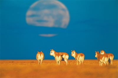奚志农的作品《新年阳光下的藏羚羊》。