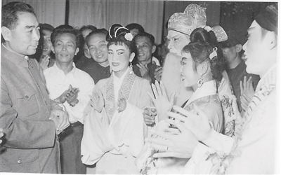 1960年1月,周恩来总理在海南观看琼剧《红叶题诗》后接见演职人员。