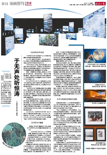 在2021年和2022年的交汇点,琼籍艺术家陈海带着自己的“海岛 无声艺术计划”展回到故乡。绘画、影像、装置、新媒体……陈海带来的每一件作品都在用新颖的艺术形式传达自己对海南的情怀和对自然的敬畏。