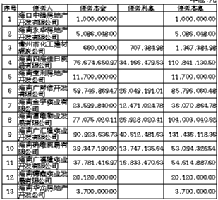 根据相关协议,海南省扶贫工业开发区总公司已收购了对下表所列单位的债权(债权利息暂计至截止日。截止日至实际偿还之日止的应付利息按原借款合同及人民银行的有关规定届时另行计算),现公告要求债务人、担保人及其他义务人立即向海南省扶贫工业开发区总公司履行相应合同约定或法院判决所确定的义务(若债务人、担保人及其他义务人因各种原因更名、改制、歇业、吊销营业执照或者丧失民事主体资格,请相关承债主体、清算主体代为履行义务或者承担清算责任),利息计算截止日为2004年10月20日。