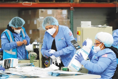 1月14日,工人在美国新泽西州帕特森的N95口罩生产车间工作。