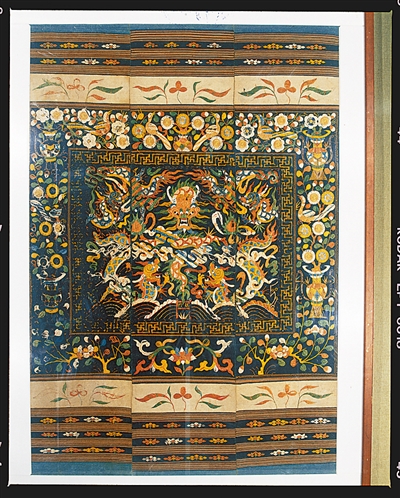 清代黎族五龙出海图龙被,长176cm,宽116cm。现藏海南省博物馆。此龙被由三幅彩锦连缀而成。主体图案为“五龙出海”图,龙舞沧海,气势恢宏;外圈饰以花鸟博古图,寓意“锦上添花”。此龙被构图严谨,层次分明,图案生动,色彩丰富,工艺精良,品相完好,为现存龙被中的精品。