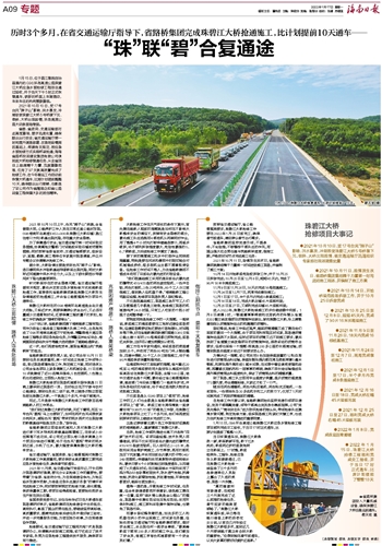 1月15日,G98环岛高速公路珠碧江大桥应急水毁抢修工程项目顺利完成交工验收,于当日17时正式通车,比原计划提前了整整10天。