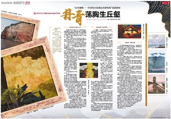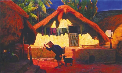 例如张祖英的《日落辉煌》《群山初醒》《薄暮初上》等作品,表现了中国西南梯田的自然与生活的景象,画家抓住梯田群山间日落、日出的瞬间色调变化,营造出独特的意象世界,辽阔而深远,瑰丽而神奇,表达了自己对于自然的崇敬、向往和赞美。