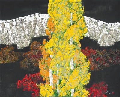 例如闻立鹏的《交响蓝白黑》《西风烈》《春雷二号》等作品,是以山石、枫树等具有象征性的形象为主体,用单纯浓郁的红、橙、蓝、绿、白等极富情感内容的色彩构筑成画面意象,形成了超越现实的壮烈崇高、坚韧深远的精神世界。而陈均德的《如诗水乡》《万木秋声》,以浓厚明丽的色彩与线条,铺就了灿烂纯净、宁静清逸的意象世界,表达了自由烂漫、拙朴超然的人生理想之境。