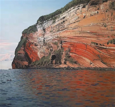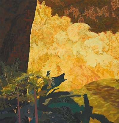 第二代油画家苏天赐吸收中国画的写意性用笔而具有大写意特质,其参展作品《霜晨》从生活的感悟出发,以强烈夸张的橙色为主调,营造出层林尽染的深秋意象,别具苍润幽深的诗意之境。