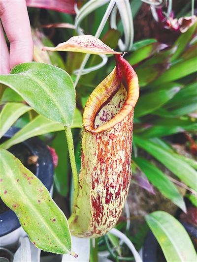 和猪笼草具有相似外观和猎捕手段的是瓶子草。瓶子草叶子呈瓶状,或直立或倾斜,大多颜色鲜艳,叶片上有绚丽的斑点或网纹。“瓶子草长有捕虫瓶,为了解决捕虫瓶中液体过多易导致倒伏的问题,它进化出了瓶盖。瓶盖是位于瓶口处的宽大叶状结构,覆盖了整个瓶口,使雨水不能进入瓶中。”陈金花介绍。