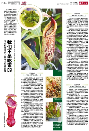 这不是想象。在海南植物界的“大观园”里,就有这样一批逆袭者——食虫植物。它们既可以进行光合作用,又可以吸引、捕捉、消化昆虫、线虫、浮游生物,甚至小型脊椎动物,以满足其生长发育的需要。