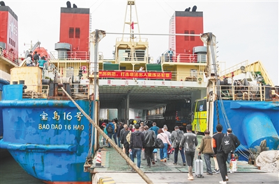 1月17日,在海口秀英港,旅客有序走进客滚轮。