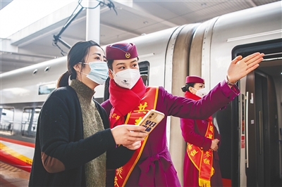 1月17日,在重庆北站,G8612次“共青团号”列车工作人员为旅客提供帮助。 新华社记者 唐奕 摄