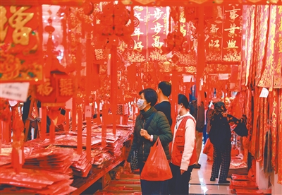 1月19日,在海口骑楼老街,市民选购春联。春节将至,海口骑楼老街的商家“年货大战”已打响。售卖年货的店铺里,一副副春联、一个个中国结、灯笼串,还有种类繁多的新年礼盒整齐地摆放在显眼位置,让人感受到浓厚的新春气息。本报记者 李天平 摄