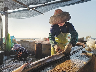 渔民在处理加工新鲜鳗鱼。 本报记者 李梦瑶 摄