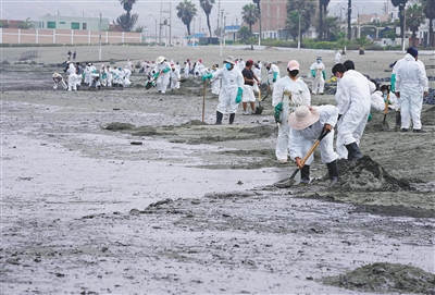 1月20日,在秘鲁安孔,工作人员身穿防护服清理被污染的海滩。 秘鲁政府20日宣布进入环境紧急状态,缘由是汤加火山喷发掀起的巨浪导致一家炼油厂发生石油泄漏,污染这个南美洲国家21处海滩。秘鲁政府说,一艘悬挂意大利国旗的油轮15日在太平洋沿岸地区拉潘皮拉炼油厂附近海域泄漏了6000桶石油。