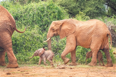 1月17日,在肯尼亚桑布鲁野生动物保护区,小象双胞胎和象妈妈走在一起。