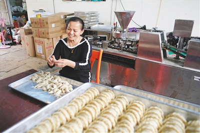 目前,除了家人帮忙,符玉芳的公司还请了四五个工人。1月16日中午,记者在符玉芳家看到,因为太忙,工人们只能轮流吃饭。他们有的在包酥饺;有的拿着锅铲从油锅里捞酥饺;有的用袋子装酥饺。