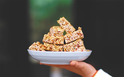 花生碎是制作糖贡必不可少的配料。在村民符京家中记者看到,伴随着锅铲的上下搅动,锅内的花生碎、芝麻、糖浆早已融为一体,焦糖味和米香味扑鼻而来。正在掌勺的符京和妻子林亚良将炒好的糖贡原料倒入一个正方形的木容器中,用扁平的铁碗压平,再将一整块糖贡切成小块。