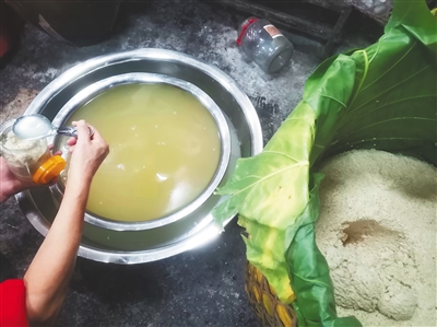 海南日报记者采访时,符美金打开一筐已发酵数天的糯米,只见筐底有一个小孔,乳白色的酒浆正一滴一滴掉入位于筐下方的一个陶罐里,这就是新酒。