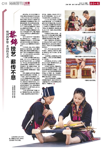 然而,随着社会的发展,黎锦织造技艺正渐渐远离人们的视野。为了抢救、保护和传承黎锦工艺,2005年,黎锦织造技艺被列入省级非遗保护名录;2006年,黎锦跻身列入国家级非遗保护名录;2009年,联合国教科文组织批准“黎族传统纺染织绣技艺”进入首批急需保护的非物质文化遗产名录,成为世界非物质文化遗产。