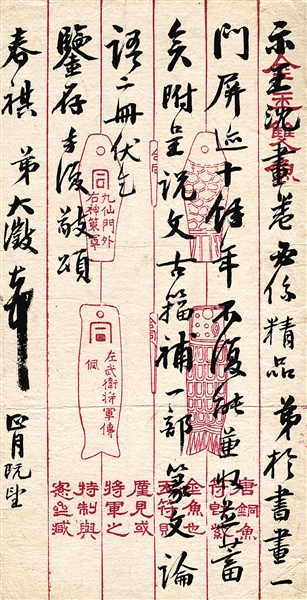 同为清代金石学家的吴大澂,也在自制笺上注入藏品元素,比如他制作的龙节笺,雕印了所藏龙节正背两面拓本。薛冰的书札收藏中也有吴大澂的作品。“吴大澂擅书法,尤以篆书为佳,他给朋友写信也爱用篆书。据传,当时的书法家潘祖荫很欣赏吴的书法,吴给潘写信便格外认真,都用籀文。潘将吴的信一一装裱起来,不到半年已有四大册。潘就跟吴开玩笑说,老弟以后写信可以稍为草率点,不然我都付不起装裱费用了。”