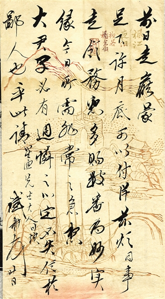 “我的书札藏品中,虽然有的笺面已经写上了文字,但大部分图案仍清晰可见,不少写信者的书法,足以为笺纸增辉。”薛冰说,在中国画中,山水画是一种重要类型,花笺上的图画常以地方名胜、景观风物为题材,但要在方寸之间表现山水意境,且只能勾线白描,颇不易经营,故而勾绘山水的花笺相对较少。