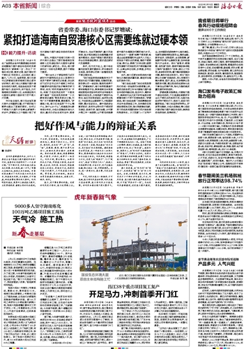 在石碌水库除险加固工程施工现场,工人们有的在安装钢筋,有的在拆除脚手架。据介绍,为加快推进项目建设,该项目春节期间不停工,部分一线工人“就地过年”,坚守岗位。春节黄金周结束后,项目施工方组织大巴车将放假的部分工人接回工地开工,稳步推进项目,跑出建设“加速度”。