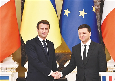 2月8日,在乌克兰首都基辅,乌总统泽连斯基(右)与法国总统马克龙在记者会后握手。