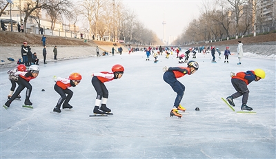 “今年练习滑冰的小朋友明显比以前增加了许多。”在冰球区域,手持冰球棒,仅穿着单薄毛衣的俞锦格外惹眼。娴熟连贯的动作让人很难相信他已经58岁,从20岁开始打冰球的他,几乎每年冬天都会在户外冰场与同伴练习。“冬奥会的浓郁气氛带火了冰雪运动,今年的金沟河非常热闹,几乎每天得有上千人来滑冰。”他说。