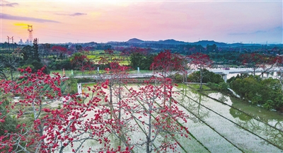 “木棉花的美在于这红与绿的相映成趣,红的是木棉,绿的是稻田,美不胜收。”来自海口的摄影爱好者黄海明说。