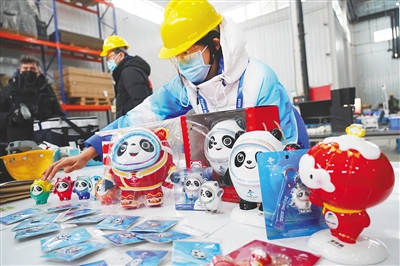 图为一名志愿者在北京金马工业园仓库向记者展示带有吉祥物元素的北京冬奥特许商品样品。新华社发