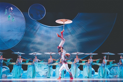 杂技艺术,中外有之。值得一提的是,《化·蝶》采用的大多都是中国味儿十足的杂技技术。譬如空竹,其灵动映照了蝴蝶飞舞的自由自在;抖杠表达了梁山伯与祝英台遭到封建社会的阻拦和压迫;蹬伞则营造出梁祝分别时的无限离愁别绪。
