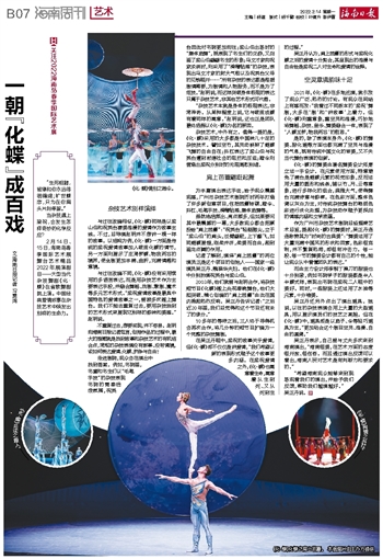 2月14日、15日,海南岛春季国际艺术展舞台艺术精品2022年展演剧目——大型当代杂技舞剧《化·蝶》在省歌舞剧院上演。中国经典爱情故事在杂技艺术中焕发出别样的生命力。