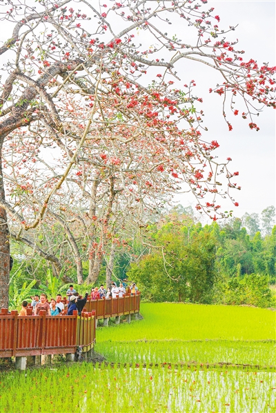 昌江七叉镇的木棉花绽放,吸引游客前往赏花。 海南日报记者 陈元才 通讯员 杨耀科 摄