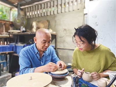 “修坯是精细活,稍有不慎,陶坯便会碎掉。”三亚学院艺术学院学生邓嘉颖说,东崖柴烧工作室制作的大多是茶壶、茶杯等器具,修坯需掌控好刀的方向和力度,这种技巧无法从书本中学会,只能在实践中摸索,通过不断“试错”找到感觉。
