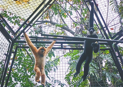 2月14日上午,在海南热带野生动植物园,从浙江杭州动物园远道而来的雌性北白颊长臂猿“命大”与雄性北白颊长臂猿“亮亮”合笼。 ①“命大”(左)和“亮亮”合笼。