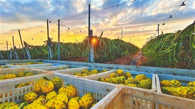 ■ 本报记者 张文君 特约记者 方宇杰2月14日,位于东方市三家镇乐安村的燕窝果种植基地内,表面带刺、浑身金黄的燕窝果从一条条枝藤上垂下来,村民罗张亭等人正忙着采摘燕窝果并装筐。今年1月起,该基地约100亩燕窝果开始成熟上市,采摘期将持续到6月。