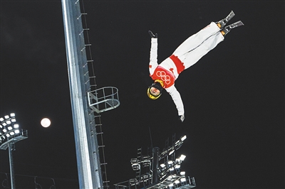 2月15日,元宵佳节,一轮圆月映照张家口云顶滑雪公园,各国选手抓紧时间进行自由式滑雪男子空中技巧资格赛的赛前训练。