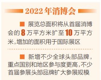 2022年消博会展览总面积将从首届消博会的8万平方米扩至10万平方米,增加的面积用于国际展区。