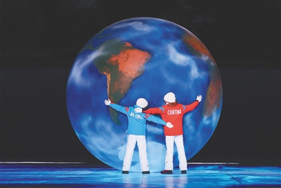 循着场地边缘一道亮光,两位意大利小朋友推动手工制作的地球走向中央。下一届冬奥会举办地八分钟表演“双城璧合·聚力联辉”拉开序幕。四年后,活力四射的时尚之都米兰将携手山川环绕的科尔蒂纳丹佩佐,共襄冬奥盛会。山川与城市、自然与建筑相互映照,在共舞中寄寓着人类和自然间的彼此尊重、相互对话。