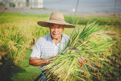海南三亚崖州湾南繁育种基地,一位农民展示刚收割的测产海水稻。海南日报记者 张茂 摄