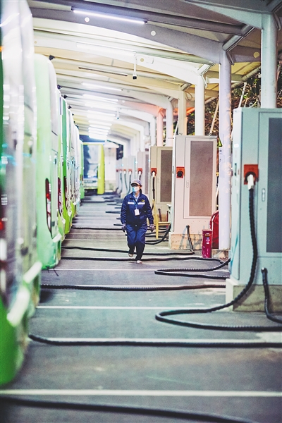 王瑜所在的城西站共有40个充电桩,保障周边线路70余辆新能源公交车的充电需求。该站24小时开放,除站长外,3名“桩主”三班倒,保障公交车可随时充电。
