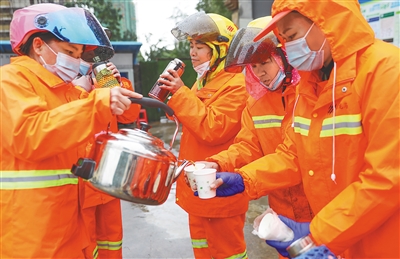 2月21日,在海口市金牛路的垃圾转运站,环卫工人饮用热腾腾的姜茶。本报记者 李天平 摄