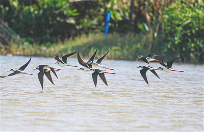 海口市美兰区演丰镇下塘湿地保护小区,一群黑翅长脚鹬掠过水面。海南日报记者 李天平 摄