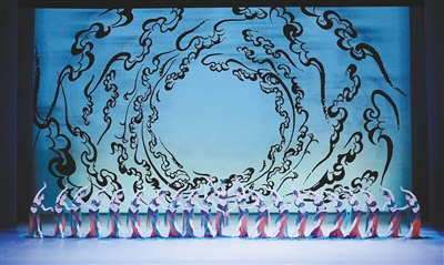 敦煌艺术与“敦煌人”相互并存的段落,同样是最具观赏性的部分。该剧将迦陵频伽神鸟的艺术形象置于舞台,并从壁画的姿态中衍化出芭蕾舞姿,把灵动的美音鸟之舞展现在观众眼前。此外,快速旋转的胡旋舞,轻盈灵活的柘枝舞,姿态变化万千,演绎出的跪、闪、拜、卧、蹲等一连贯动作,令人目不暇接。