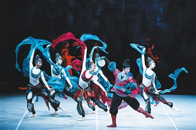 《敦煌》以芭蕾和中国舞、民族民间舞相结合的方式演绎敦煌石窟中的飞天壁画,其中的“飞天”“伎乐胡旋”“美音鸟”等经典舞段展现了传承千年的敦煌艺术结晶。“中国有很多舞蹈学者在研究敦煌壁画中出现的舞蹈,比如颇具西域风情的胡旋舞、柘枝舞,这些舞种最大的特点在于曲线性。而芭蕾最大的特点是直线性,不过这两者并不矛盾,我们将二者结合,用芭蕾的语言表现飞天舞、胡旋舞,让舞者用芭蕾的肢体去追寻壁画中一笔笔的灵动与充满生机的线条。”费波说。