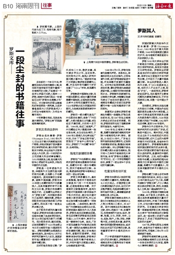 文\图 本刊特约撰稿 胡素萍多年前的一个秋日午后,带着雨后阳光而来的晴朗心情,我在图书馆洋溢的书香中翻阅一本海南历史文献,不经意间一个名字从字里行间跃入眼帘——罗斯,脑海中迅疾闪现出一枚曾经见过的“罗斯先生遗赠之书”印记。对文献资料的职业敏感和好奇促使我一探究竟,从名字看像是西方人的罗斯是何人?为何会与海南有关?为何会与赠书有关?