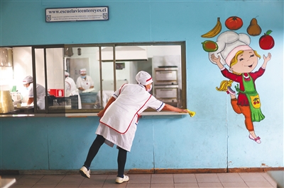 2月28日,在智利首都圣地亚哥的一所小学,工作人员清理午餐区。智利即将迎来新学期。新华社/路透
