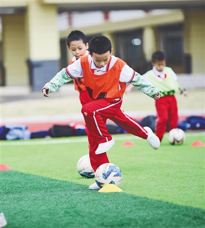 “双减”落地 海口康安学校学生上足球兴趣课。