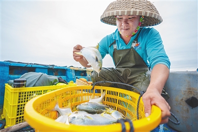 渔业升级 三亚西岛深水网箱养殖基地渔民捕捞金鲳鱼。