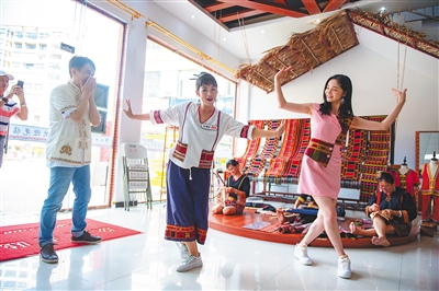 时尚博主和黎锦传承人(中)一起直播“卖货”,推荐白沙黎族特色产品。
