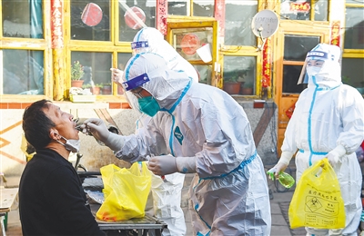3月6日,在呼和浩特市赛罕区东瓦窑社区,网格员(右一)辅助医务工作者为次密接群众上门做核酸检测。